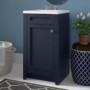 This small bathroom vanity set is ideal for maximizing storage in compact spaces. Measuring 18.5" wide by 16.75" deep, this narrow single-sink vanity features a 1-door under-sink cabinet for easy access to your plumbing and open storage space. Its inset recessed-panel door is accented by a satin nickel door pull for added style and convenience. The pre-assembled bathroom cabinet is constructed of laminated engineered wood and is complemented by a 1-piece cultured marble countertop.