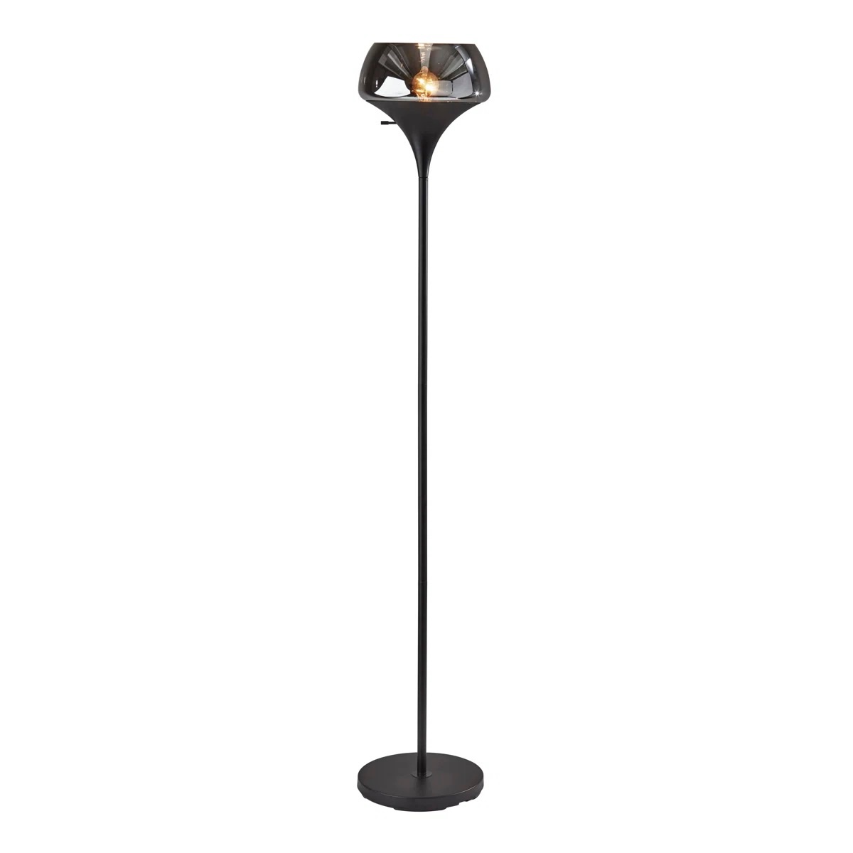 The Bysshe Torchiere is sure to stand out in your home whether it is turned on or off. The options are endless with this edgy, contemporary style. Black metal is mixed with a smoked mercury glass shade. A convenient 3-way rotary switch is located on the shade cup. The 3-way rotary socket switch will only work with a 3-way light bulb, otherwise this lamp will function with simple on/off switch at its highest setting.