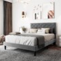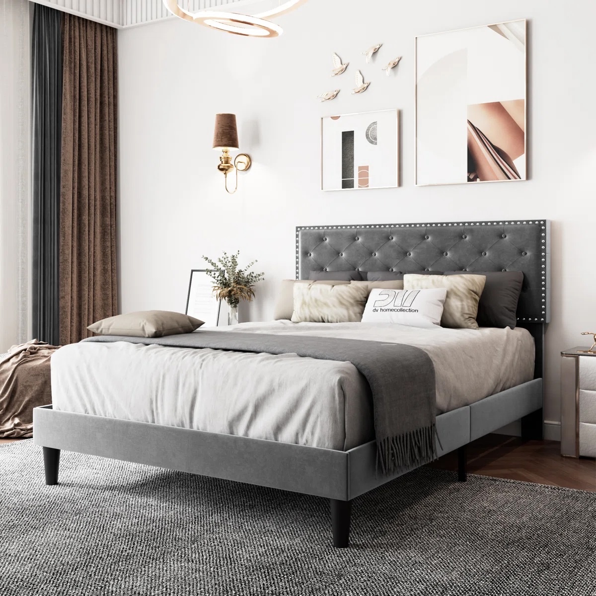 This platform bed features an adjustable headboard, so it's an ideal option for people of all heights and sizes. It has a solid and engineered wood frame that rests on black tapered legs. The frame and rectangular panel headboard are wrapped in luxe velvet and generously padded for ample support as you relax with your favourite book before going to sleep. Traditional button tufting and nailhead trim complete this distinctive design. Multiple slats eliminate the need for a box spring, so all that's left to get is a mattress of your choice (sold separately).