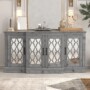 Looking for a stylish way to organize your space without compromising on flexibility? This versatile 4-door wide credenza is your go-to solution, perfectly suited as a dining cabinet, kitchen buffet cabinet, office credenza, or dining room cabinet. Crafted from durable manufactured wood, it features a tiered design with crown moulding and a sturdy base. Behind its beautifully designed mirrored doors with Moroccan-inspired quatrefoil detailing, you’ll find spacious compartments with adjustable shelves, ideal for storing anything from dinnerware to office supplies. Whether you're upgrading your dining cabinets or adding elegant storage to any room, this piece offers the perfect balance of function, beauty, and adaptability. Discover how this multi-functional credenza can transform your space today.