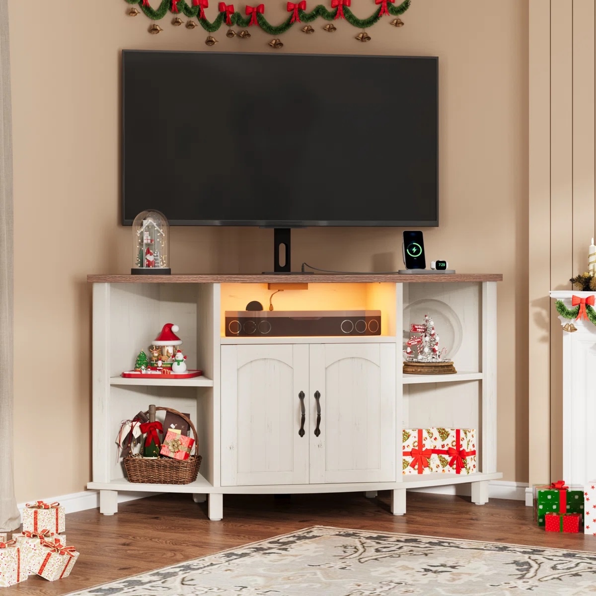 With contrast of natural brown & off-white finish, fluted cabinet door design, we love this farmhouse TV stand with mount exuding a classic, rustic temperament, seamlessly blending into modern farmhouse or traditional décor. The LED entertainment centre with storage is perfect blend with beauty and functionality. Featuring mounting bracket, you can choose to mount the TV with adjustable height or simple place the TV on this corner TV stand neatly . Features 2 AC power outlets, 2 USB ports for easy charging, ample storage space with adjustable shelves, sturdy engineered wood construction for 300lbs. Elevate your room atmosphere with colourful LED lightings , also adding a warm, rustic touch to your residential.