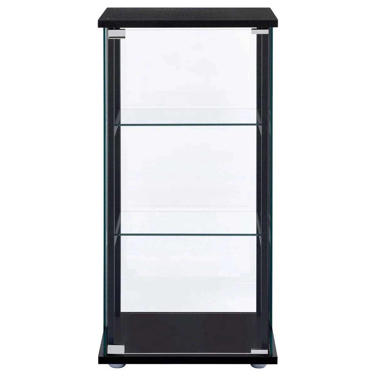 A modern version of a true classic makes a fabulous addition to a transitional space. With linear styling and a fresh look, this curio cabinet offers a perfect venue for showcasing treasured decor. Bold black tops with a simple frame, top, and base. Tempered glass shelves create transparent space for display. Access its interior easily with push-to-open doors.
