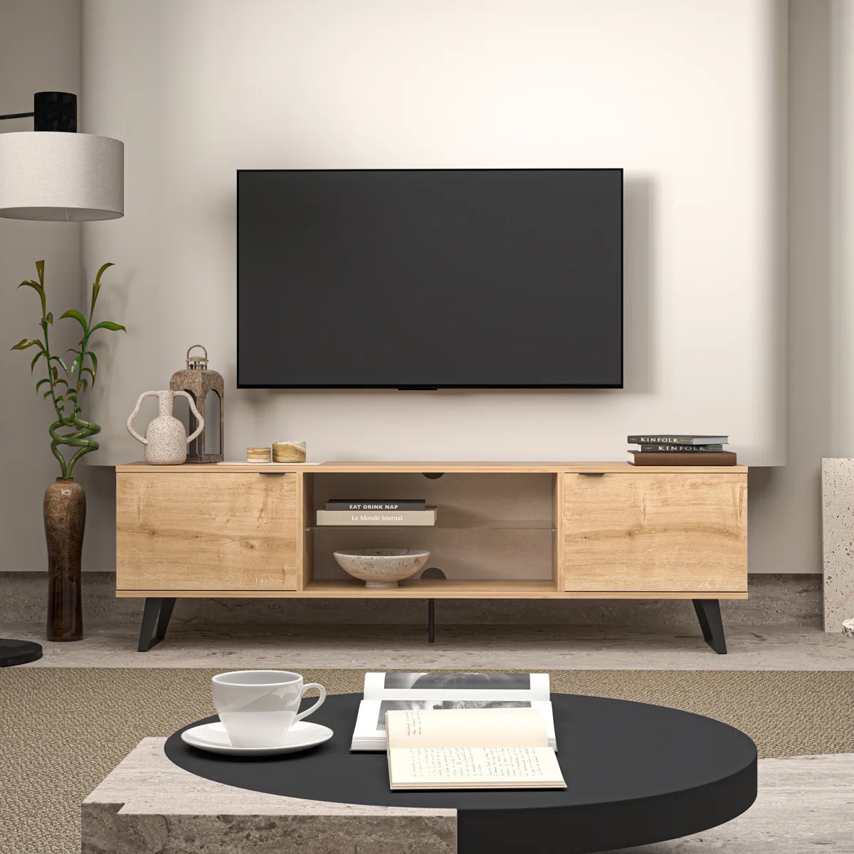 Upgrade your living room with the sophisticated, contemporary and mid century modern Salda TV Stand. This sleek and modern stand is available in your choice of oak, walnut and mixed colour finishes, allowing you to customize it to your personal style. With its unique design and high-quality construction, the Salda TV Stand is sure to become the centerpiece of your entertainment area. Measuring 71 inches in width, 21 inches in height, and 14 inches in depth, the Salda TV Stand is the perfect fit for up to 80 inch TVs. The stand features ample storage space for all your entertainment essentials, including two spacious compartments with soft close hinges for your media devices, gaming consoles, and other accessories. Crafted from premium materials, the Salda TV Stand is sturdy and durable, ensuring long-lasting use and enjoyment. Whether you're entertaining friends, enjoying a movie night with the family, or simply relaxing after a long day, the Salda TV Stand provides the perfect backdrop for all your entertainment needs.
