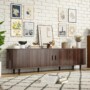 This TV stand blends modern style with practical storage, making it a versatile piece for your living room or bedroom. Built from a combination of solid and engineered wood, it showcases rounded corners and smooth tambour doors that glide open to reveal six compartments. An adjustable shelf lets you tailor the interior for media, accessories, or cable organization. Designed with vents and cable management, it keeps your electronics cool and clutter-free. Plus, it can accommodate TVs from 50″ to 80″, offering both style and functionality for your entertainment setup.