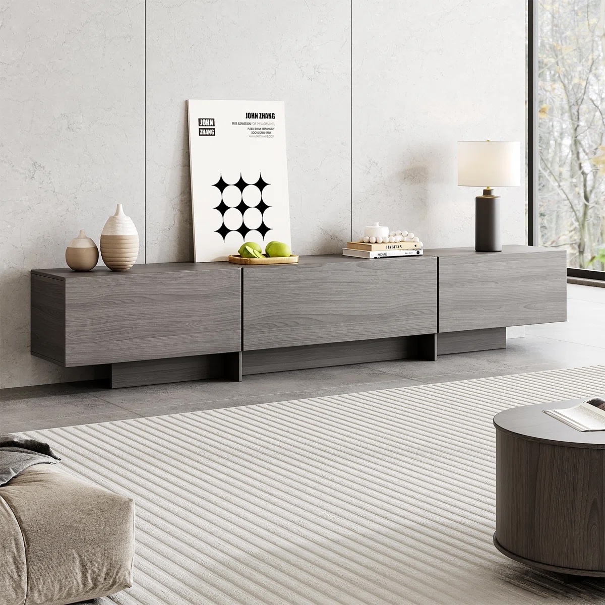 Elevate your space with this sleek media console featuring a matte-grey finish and clean square design, adaptable to living rooms, bedrooms, or offices. Its 3 cabinets and open tabletop organize TVs, media gear, and decor while doubling as multifunctional storage. Built for durability with high-quality MDF, metal-reinforced hinges. It blends minimalist aesthetics and robust functionality through neutral tones and refined lines.