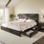 Platform bed features a natural wood grain finish and barn headboard, charming classic farmhouse element that brings a rustic.
