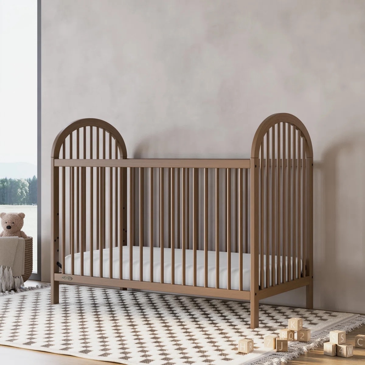 Introducing the Graco Olivia 3-in-1 convertible crib. With its clean lines, stylish curves, rounded details, and easy-to-match, arched design, the Olivia is the perfect addition to any nursery – no matter your style.