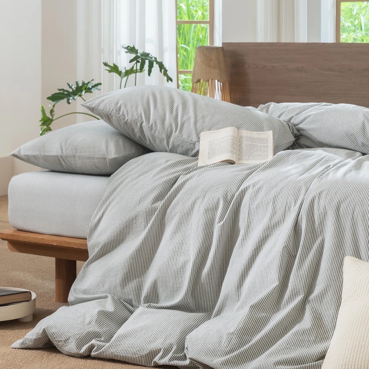 The MooMee Striped Duvet Cover Set is crafted from 100% washed cotton, it feels as soft and cozy as your favourite, well-worn cotton shirt. The breathable fabric keeps you cool in summer and warm in winter. With the look of linen and the feel of cotton, their slightly wrinkled texture adds effortless charm. Features include a hidden zip closure, 8 interior corner ties to keep your duvet securely in place, and envelope-closure pillowcases.