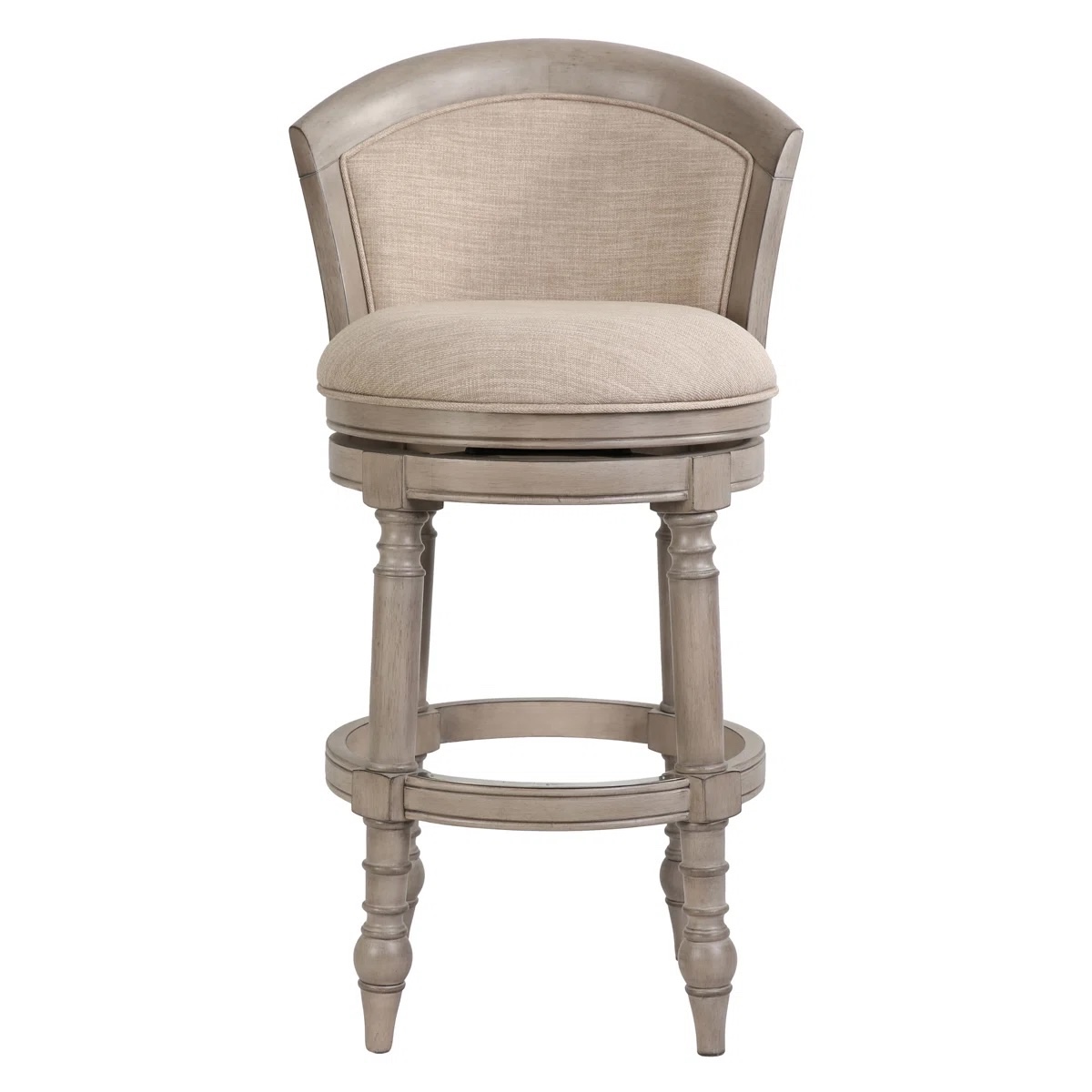 Elevate your home bar or kitchen island with this stylish, upholstered Swivel Bar Stool. This sophisticated stool, with its barrel-back design, combines classic design elements with modern comfort, making it a perfect addition to any contemporary or traditional space. This stool not only offers unparalleled comfort but also elevates the aesthetics of your kitchen or bar area. Its versatile design seamlessly blends with various décor styles, from contemporary to farmhouse chic. Whether you're hosting a casual brunch or a festive gathering, our stool ensures both style and comfort for you and your guests. Choose from Uptown Grey finish with Beige seat fabric or Farmhouse White finish with Grey seat fabric.