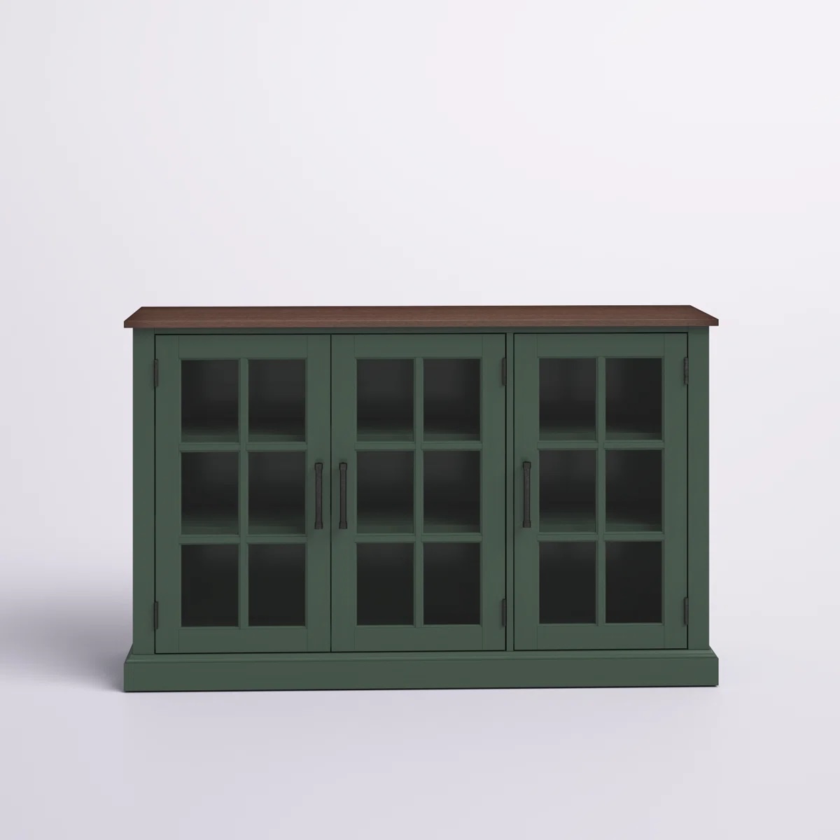 This sideboard streamlines your living room or hallway with plenty of storage and a modern farmhouse aesthetic. It's crafted from engineered wood in a solid hue and a rectangular silhouette. The design features three doors that open to reveal shelves great for storing everything from dishes to linens to charging cords. We love the window pane glass panelling, metal hardware, and block base that completes the classic vibe. Use the top as a display for your favourite decor pieces and seasonal florals.